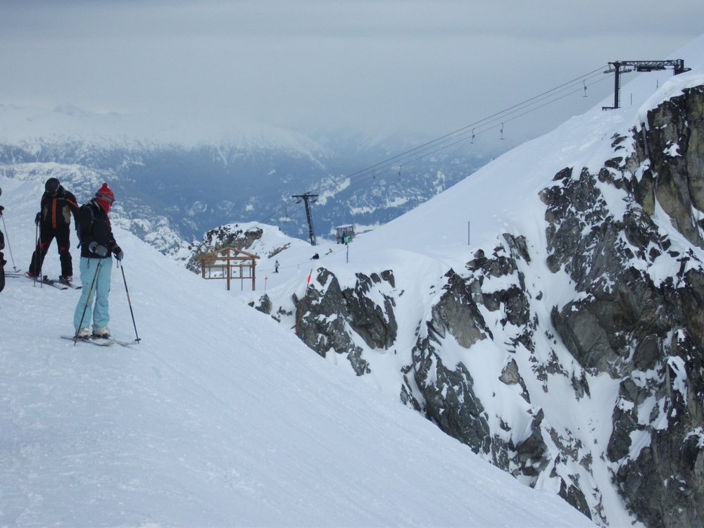 From our base in Whistler village, we headed up in the Blackcomb Gondola, slowly but surely making our way up the mountain. The higher we got, the lower down the evolutionary chain of ski transport we went: first a gondola, then a chairlift, followed by a T-bar (bane of the boarder's life) and finally a skis-off, trudge-up-hill walk. We visited the Blackcomb glacier as part of an introductory tour on our second day, and so the awe-inspiring view from the lip of the glacier was not as imposing as it might have been, but the panorama of snowtopped peaks and the dramatic drop into the glacial valley was still enough to get the heart pumping.