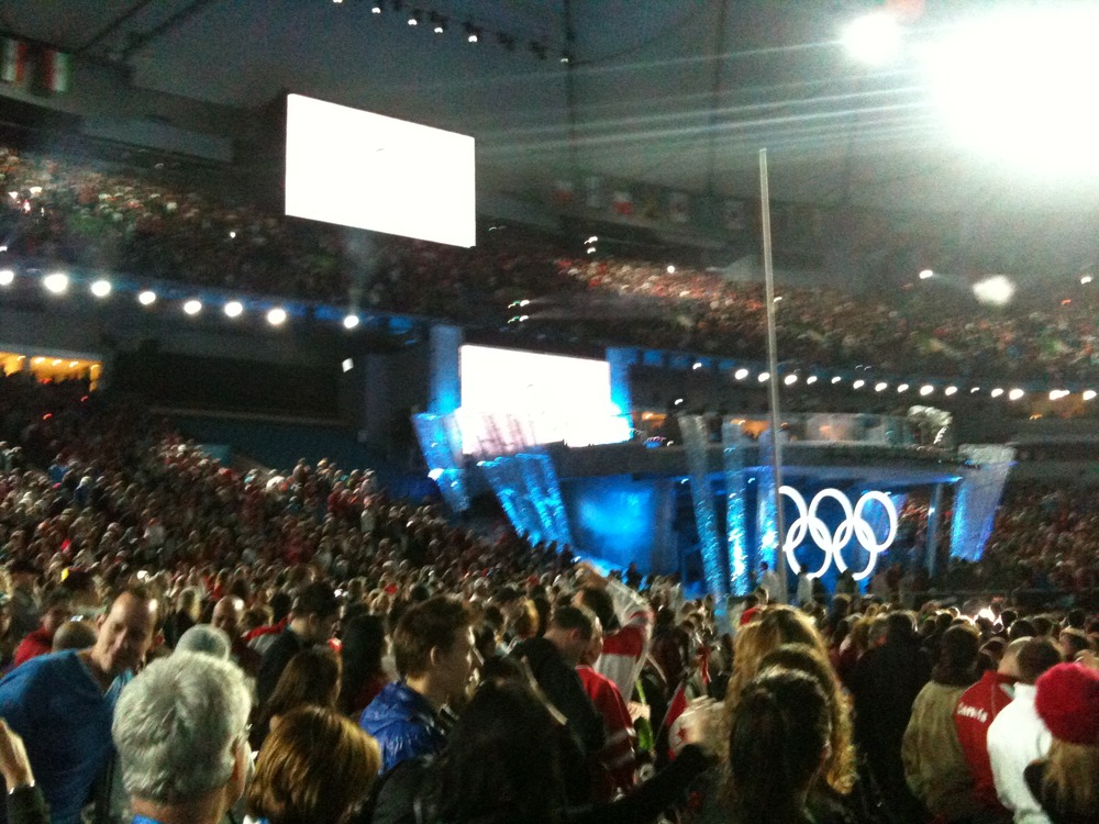 The pictures: a virtual Olympic flag flutters above BC Place’s audience; the crowd, complete with enormo-flags; the view to the stage and the actual Olympic flag; the stage from opening night, with blue plastic icicles.