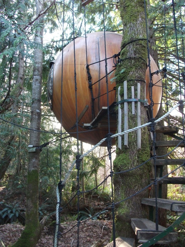 In any case, I have it on reliable authority that Ewoks (furry things, stars of a 1980s cartoon which is the extent of my encounters with them) live in treehouses, with walkways strung between them so that they have no need to ever descend to the dangers of ground level. I like to think that this creates some sort of continuity with the life imagined for Robin Hood in the 'Prince of Thieves' film; imagine, if you will, Kevin Costner being forced to carry on a sensible conversation with animated furry things in hooded capes. However, I digress. The point is, when Dave and I arrived at Free Spirit Spheres in Qualicum Bay, his response was that the suspended, spherical treehouses resembled the kind of place where an Ewok might live.