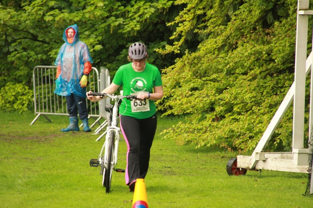 Swim successfully completed, Rachel decamped to the changing rooms to get warm, dry and into her bike outfit, while Steph ran out to the field and scrambled into her team t-shirt and shorts. The garb of the marshalls demonstrates the weather with which we grappled all morning!