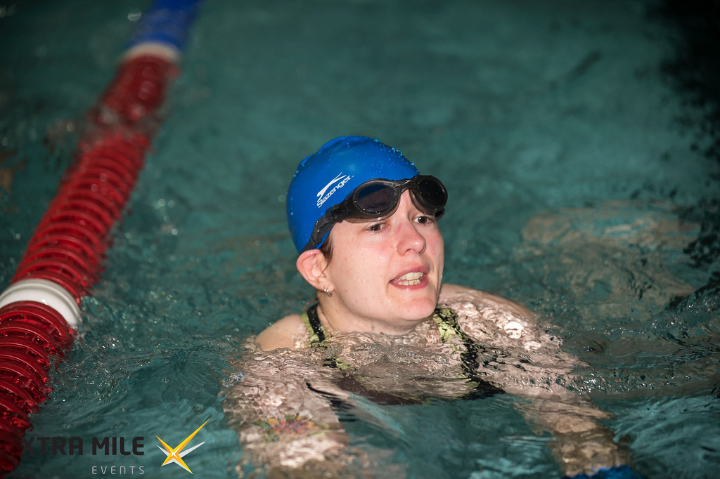Steph and Rachel were allocated to an early wave, so by 7.10am they were poolside, being briefed on the route and rules. Steph was concerned her sports bra / bikini top might unzip itself. Rachel’s numbers wouldn’t stick to her arm so she sported a handwritten marker pen number. Rachel later explained that she’d had the unenviable realisation that the pool in which she trains is somewhat less than 25 metres, which meant her training hadn’t quite prepared her for the reality.